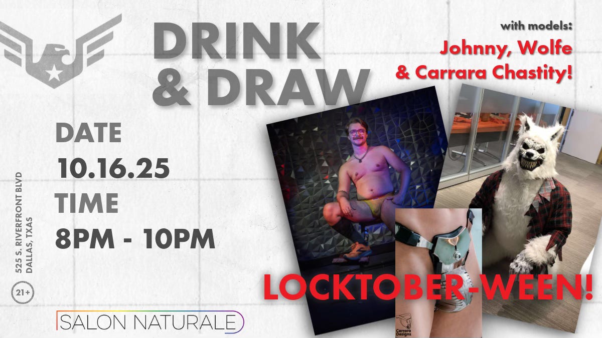 🌈🎨 Get ready for LOCKTOBER-WEEN, this Thursday (10/16) at the October Drink & Draw! We’re blending two traditions - Locktober’s playful discipline and Halloween’s campy mischief - for one unforgettable night of queer creativity. Expect models donning both costumes and Carrara chastity belts, posture collars, iron shackles, and rope bondage, posing for your drawing delight. As always, all genders are welcome. Grab your sketchbook, a drink, and join the fun at The Dallas Eagle. 🦅✨